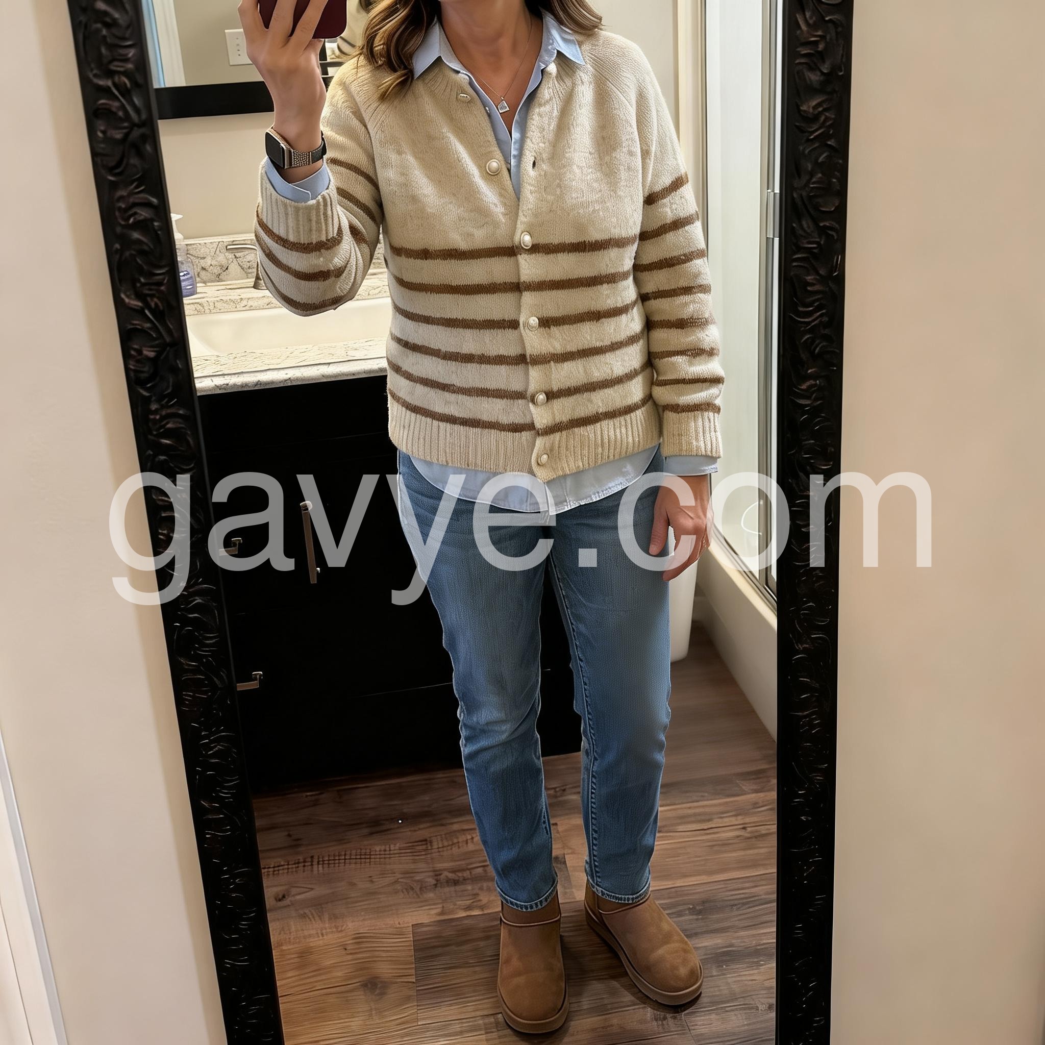 This Apricot Long Sleeve Striped Cardigan is a versatile addition to any wardrobe. Perfect for cooler days, it features a timeless striped design and long sleeves for added warmth. Made from high-quality materials, it's both comfortable and stylish, making it the perfect option for everyday wear. With its classic design and practical features, this cardigan is a must-have for any fashion-forward individual.