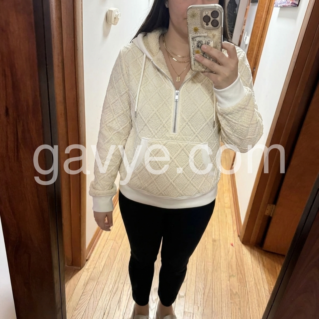 Elevate your casual wardrobe with this sophisticated beige quilted sherpa half-zip hooded sweater. The combination of quilted detailing and plush sherpa lining creates exceptional warmth without excess bulk, making it ideal for layering or wearing solo. The half-zip design offers versatile styling options and easy temperature adjustment, while the integrated hood provides additional coverage on cooler days. Perfect for transitional seasons or as a lightweight layering piece, this sweater balances comfort with refined aesthetics for the discerning wearer.